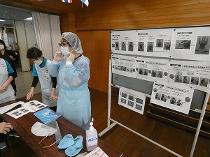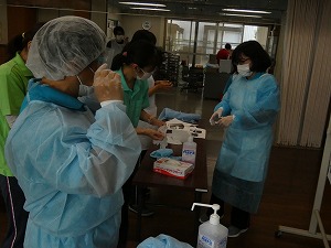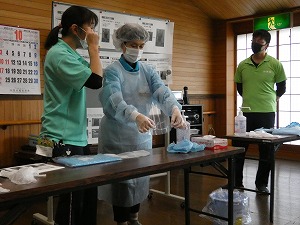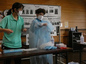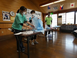 施設のご利用者は高齢で様々な疾患を抱えており、免疫力がありません。感染症が施設内で確認された時は、部屋を別にしたり、職員が媒介者とならないようマスクの他に帽子やフェースガード、エプロン(ガウン)等でウイルスを運ばないよう細心の注意が必要になります。コロナ禍に上五島病院の医師より指導を受け、それをもとにシュミレーションを実施しました。見るのと実践するのでは全く違うもので、皆さん真剣に取り組まれてます。